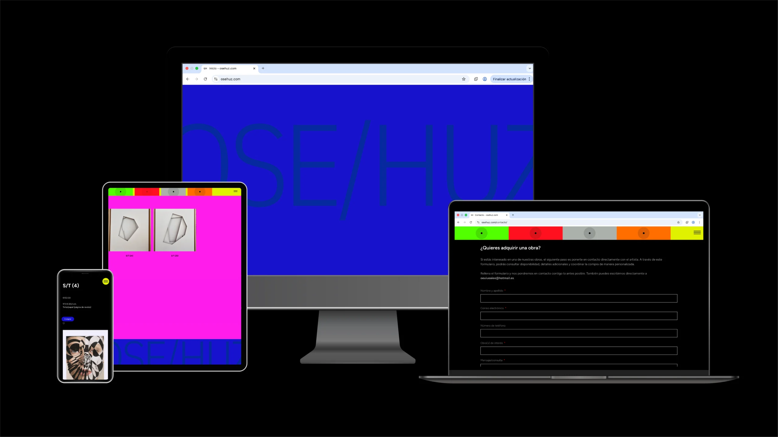 OSEHUZ.com es una web concebida como un escaparate digital de obras de arte, más cercana a una experiencia visual que a una tienda online convencional. El proyecto se desarrolló para el artista Ose Huz, cuya obra ha sido expuesta en distintos espacios y museos, y parte de la idea de trasladar al entorno digital una forma de exposición poco explicativa y más intuitiva.